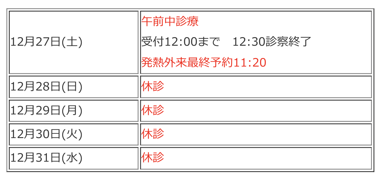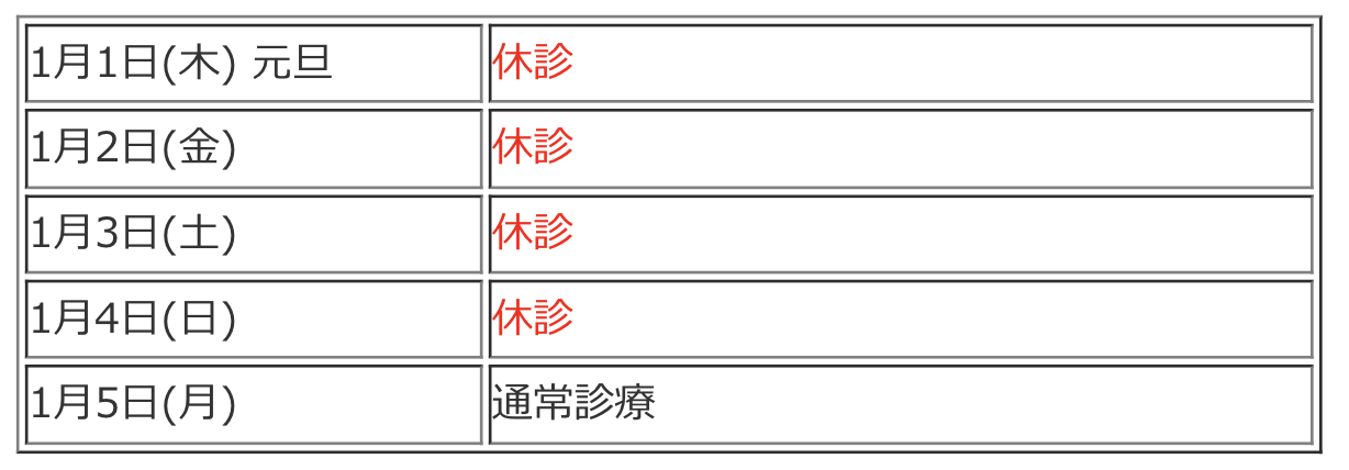 当クリニックの年末年始の休診は下記の通りとなります。 どうぞ宜しくお願い致します。